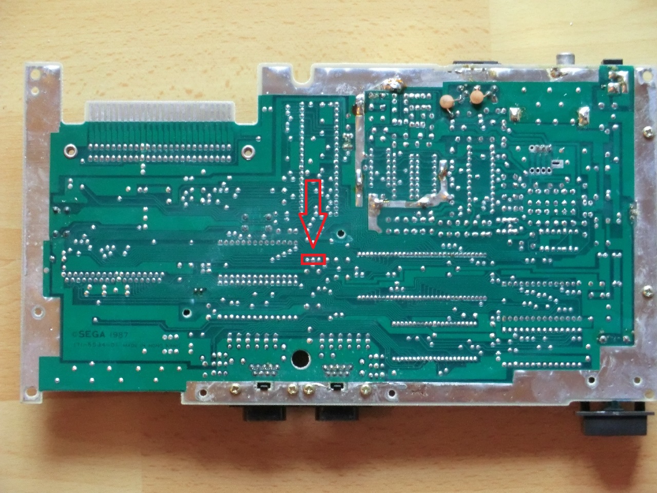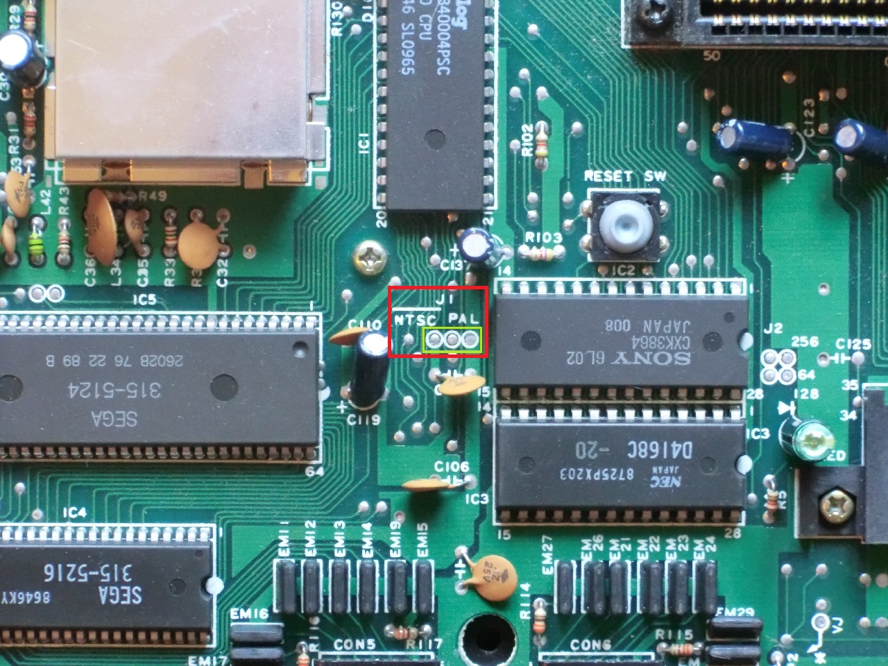 Glücklicherweise ist der Umbau vom Master System 1 relativ trivial. Sega hat netterweise auf dem Board die entsprechenden Lötstellen mit dem Hinweis PAL / NTSC versehen. Wenn man das Board umdreht sieht man, dass zwei der drei Lötstellen miteinander verbunden sind. Damit der Mod funktioniert muss diese Verbindung mit einem Cuttermesser vollständig durchtrennt werden. Wenn die Verbindung nicht richtig durchtrennt wurde starrt man später beim Umschalten auf einen schwarzen Bildschirm (ich spreche da aus Erfahrung 😀 ).
